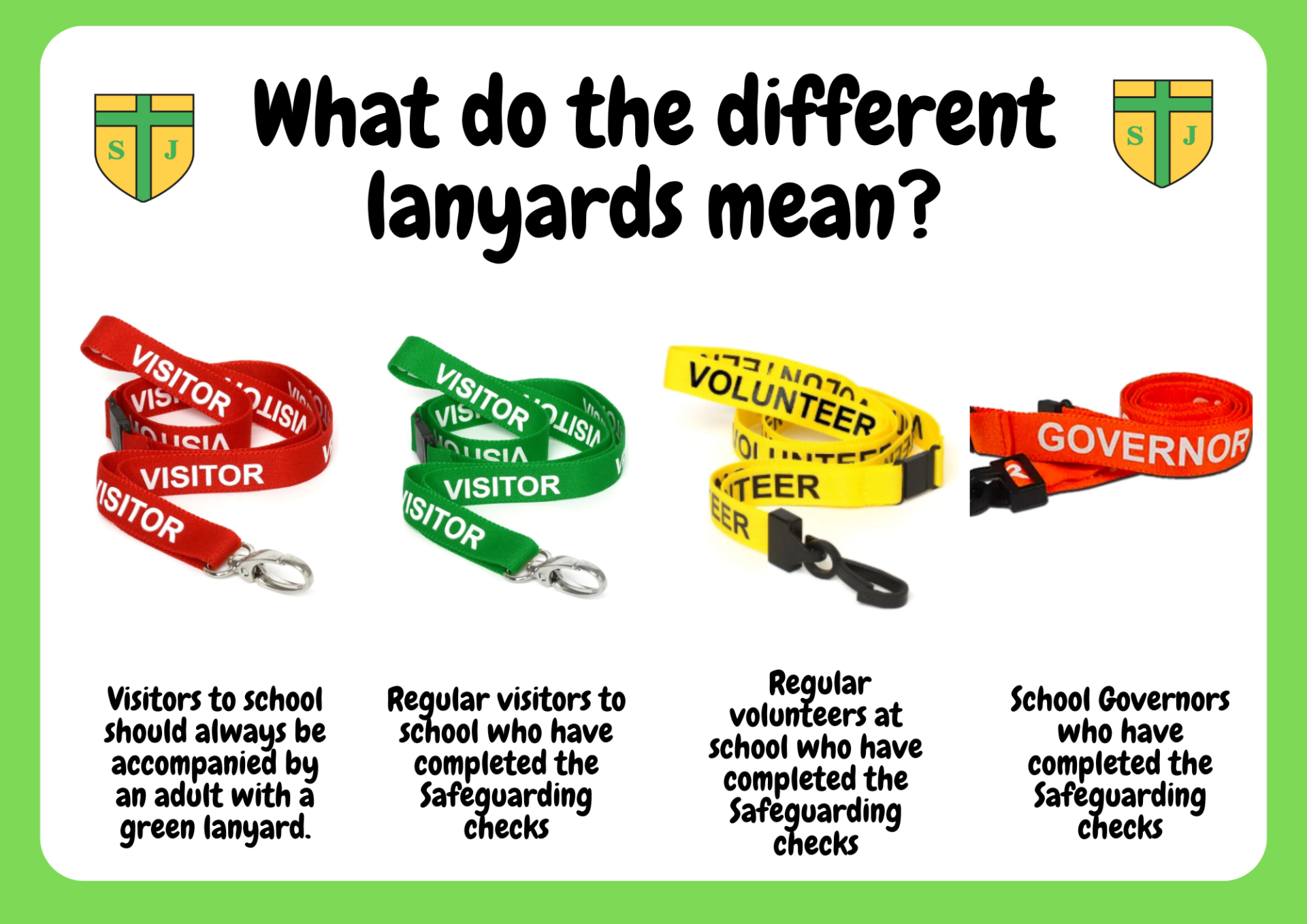 At our school, we place the highest importance on safeguarding and ensuring our children feel safe and secure. As part of this, we educate our pupils about the significance of the different coloured lanyards worn by staff and visitors. Children learn that school staff wear specific lanyards, while visitors are provided with a different colour to identify them easily. We teach our pupils to recognise trusted adults and understand the importance of reporting any concerns to a member of staff. This approach helps our children develop a clear understanding of safeguarding, promoting a safe and supportive school environment for everyone.