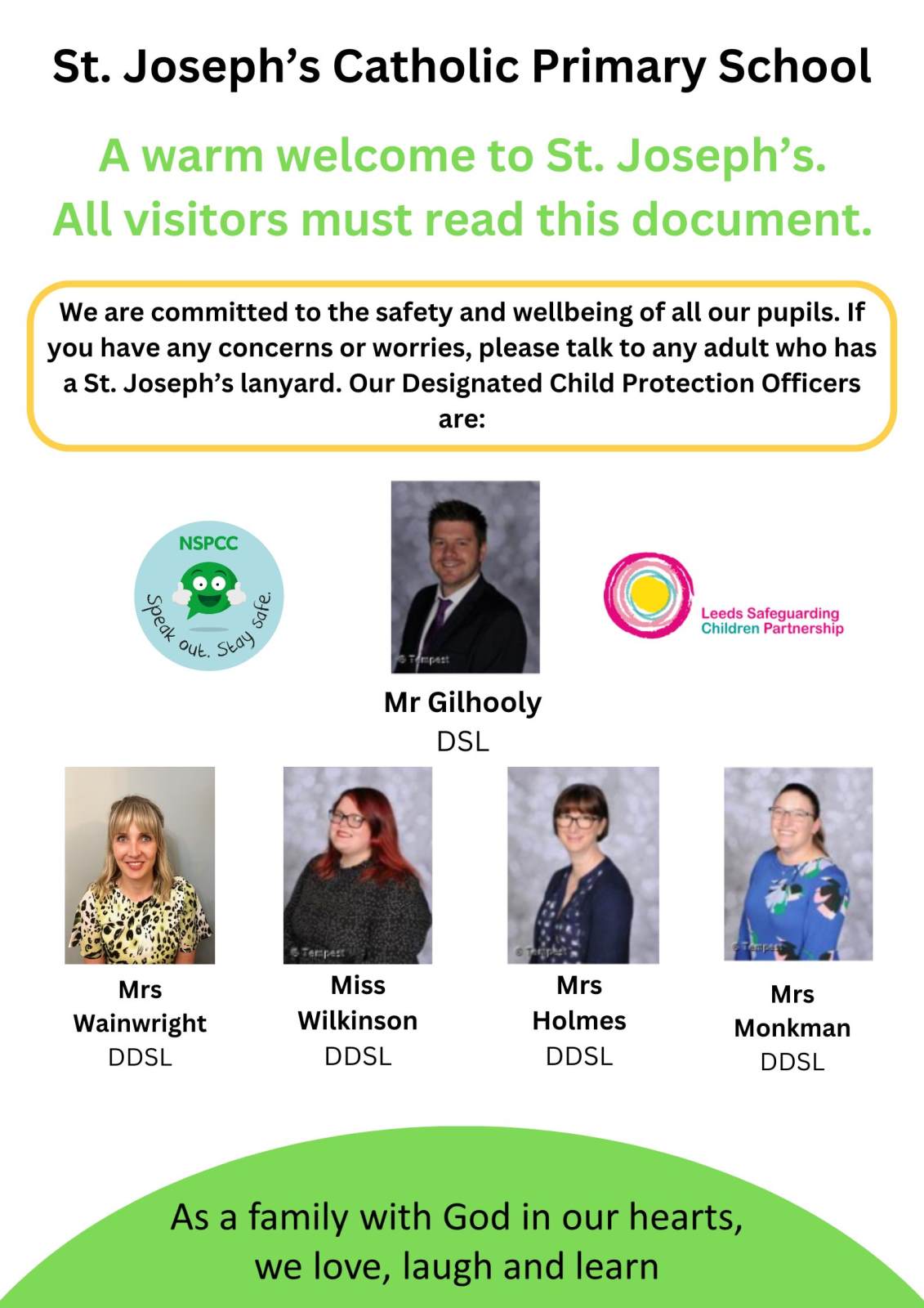 St. Joseph's Catholic Primary School is committed to safeguarding and promoting the welfare of children and expects all staff and volunteers to share this commitment. We are fully committed to ensuring that consistent effective safeguarding procedures are in place to support families, children and staff at school. All concerns are passed through the members of staff who are trained as “Designated Child Protection Officers” in school.