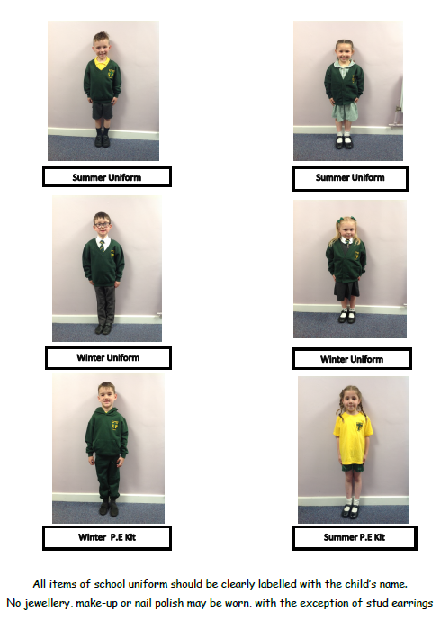 Children can come into school in their PE kit on PE days, and remain in PE kit for the whole day. This will be a green jogging trousers, yellow P.E T-shirt and the green school PE hoodie. If they do not own a green school PE hoodie then please just wear the ordinary school jumper or cardigan.